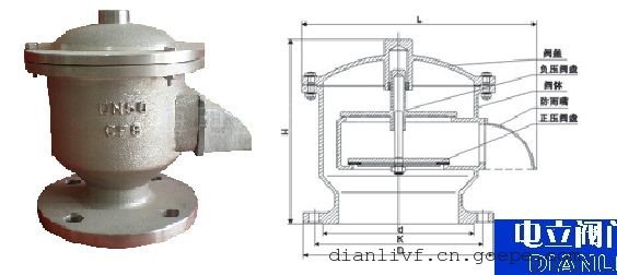GFQ-2全天候呼吸阀零部件材料:阀体材料 WCB、304、316、铝合金 正压阀盘材料 304、316、铝合金 负压阀盘材料 304、316、四氟PTFE 环境温度 ℃ -30~60 GFQ-2全天候呼吸阀主要技术参数: